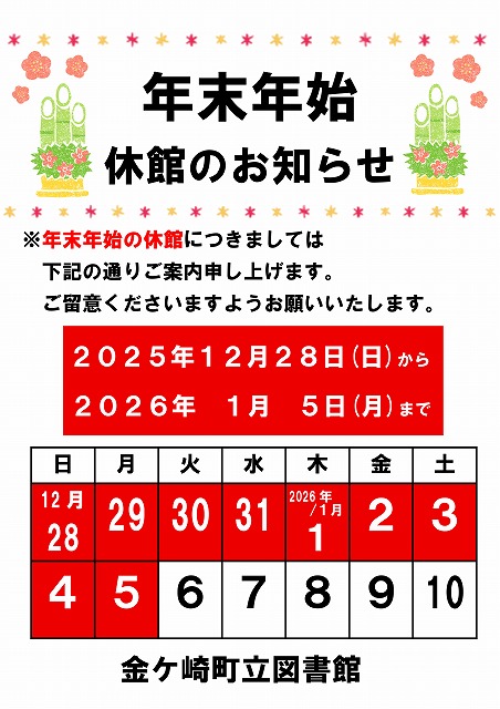 【お知らせ 2025年12月】年末年始にともなう図書館の休館日について
